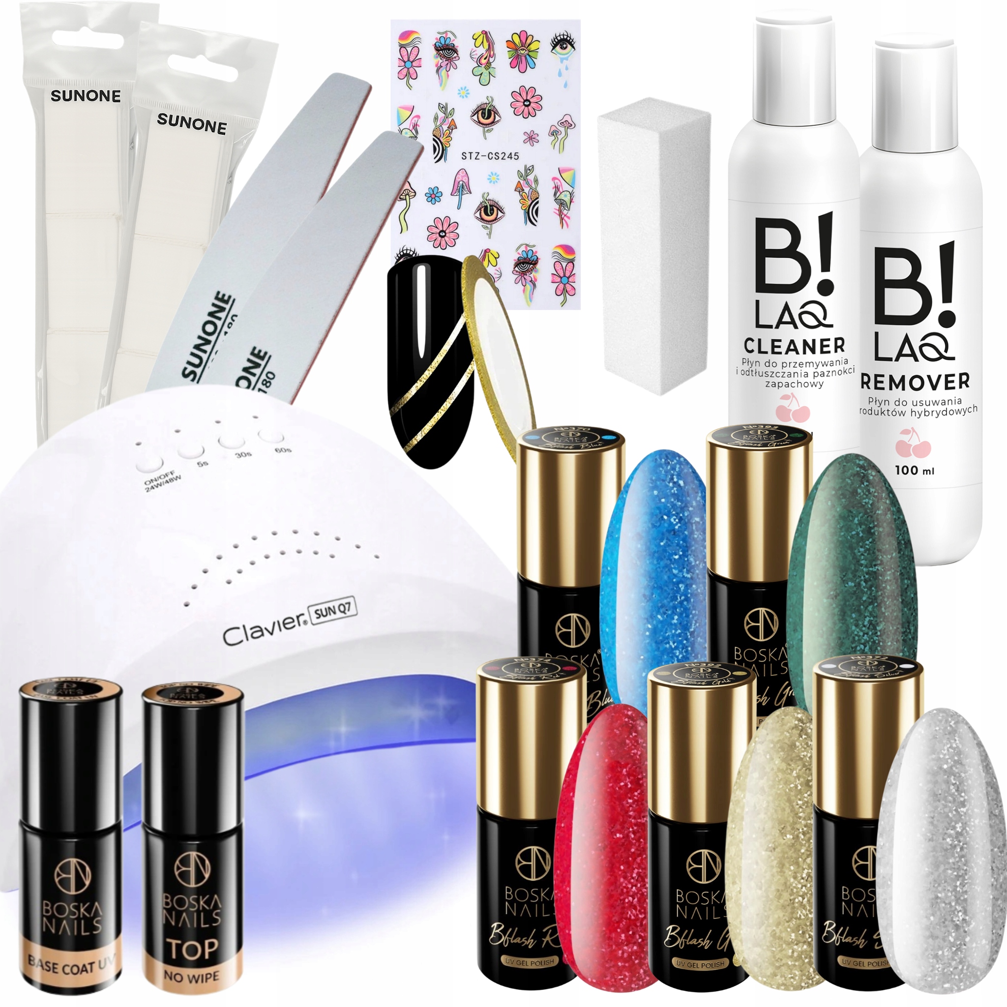 Zadbaj o perfekcyjny świąteczny manicure lub wręcz niezapomniany prezent pod choinkę! W tym zestawie otrzymujesz profesjonalną lampę LED/UV 48W do hybryd i żeli oraz komplet niezbędnych akcesoriów: od płynów przygotowujących i usuwających stylizację po pięć wyjątkowych kolorów lakierów hybrydowych marki Boska Nails z kolekcji Bflash.