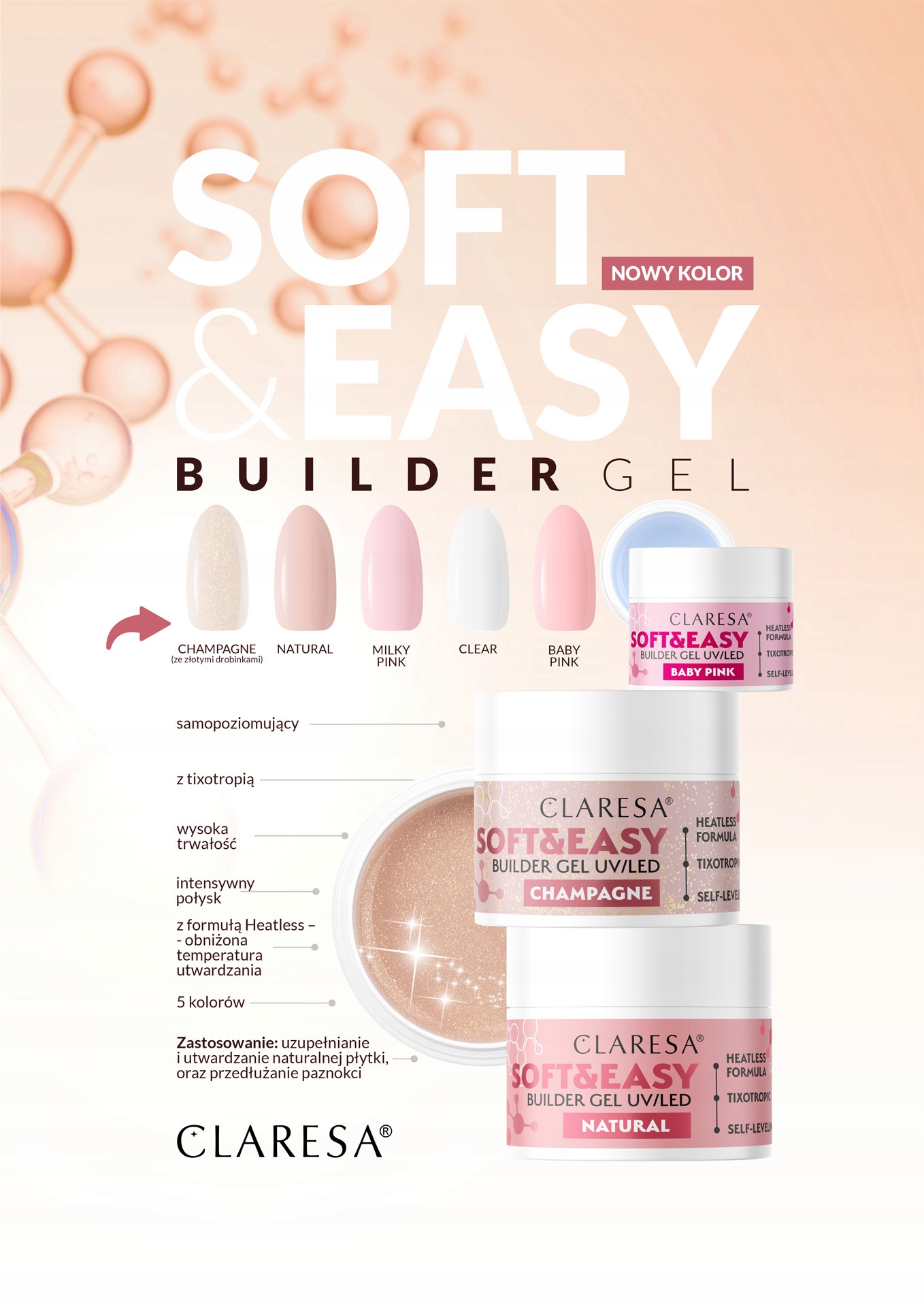 - CHAMPAGNE - naturalny, delikatny odcień nude z połyskującą złotą drobinką.