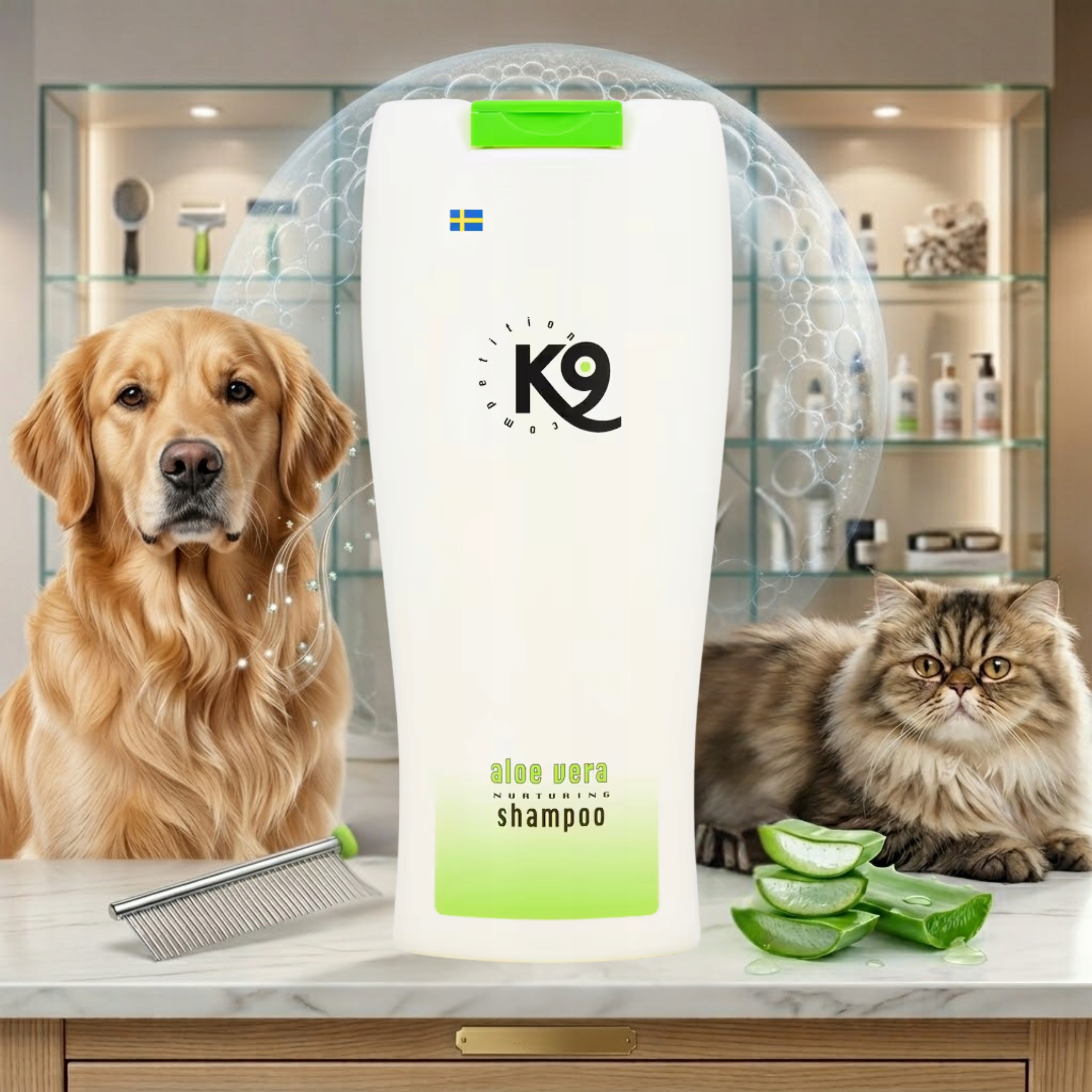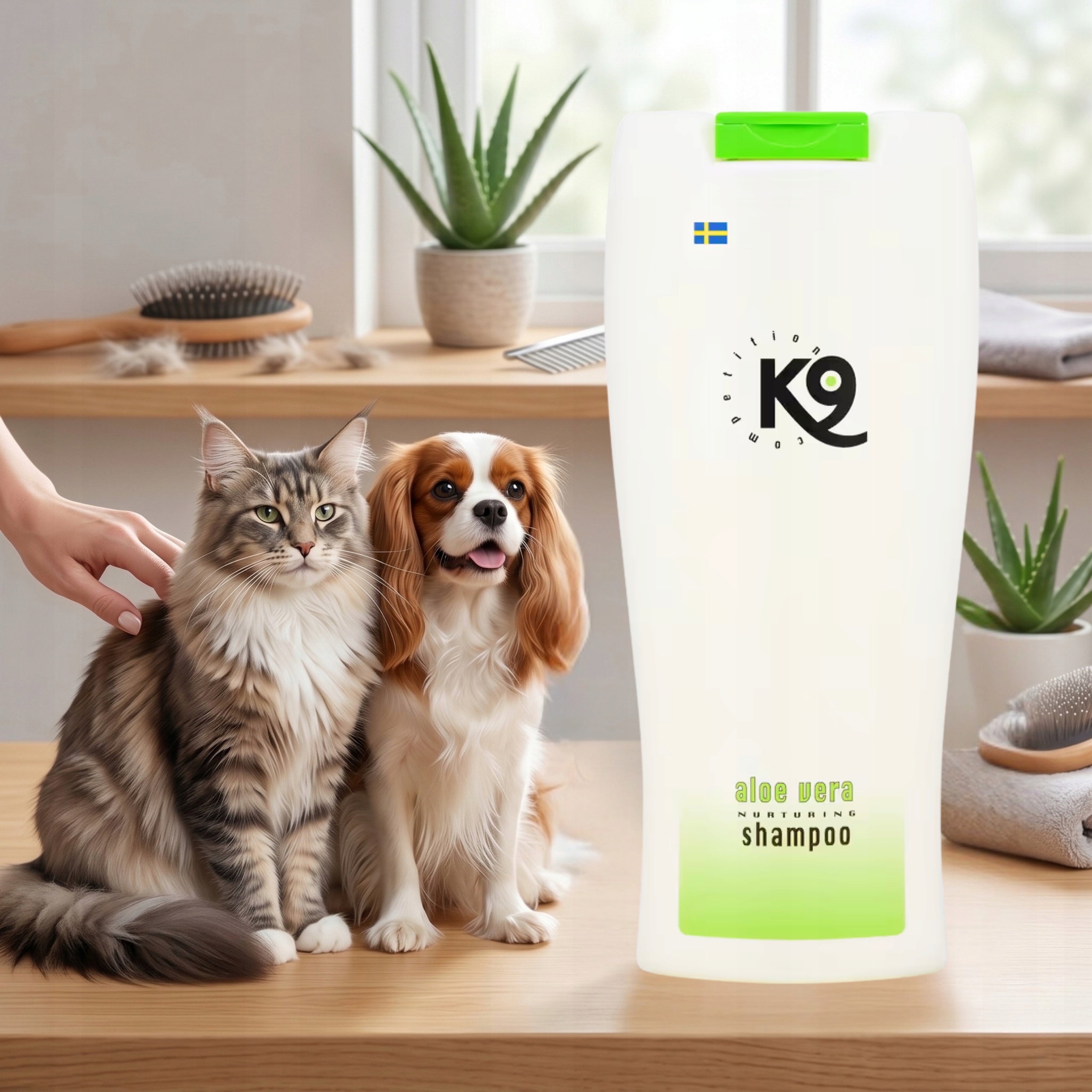 K9 Aloe Vera Shampoo 300 ml przeznaczony jest dla psów i kotów wszystkich ras i kolorów sierści – zarówno krótkiej, jak i długiej, miękkiej i szorstkiej. Szczególnie polecany dla zwierząt z przesuszoną, podrażnioną lub atopową skórą, a także dla tych z matową i trudną do rozczesania sierścią.