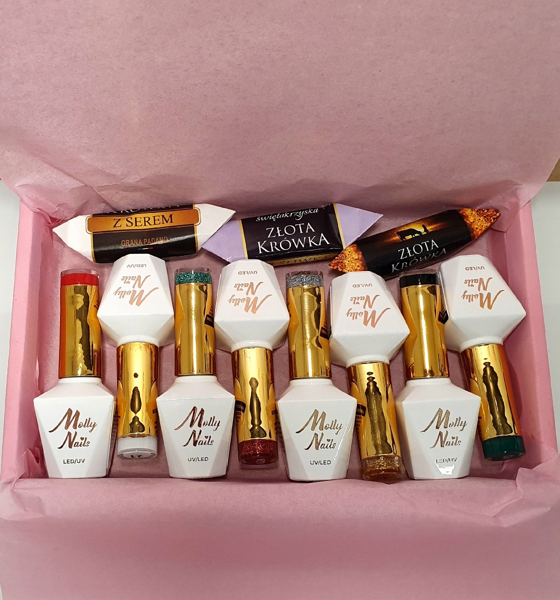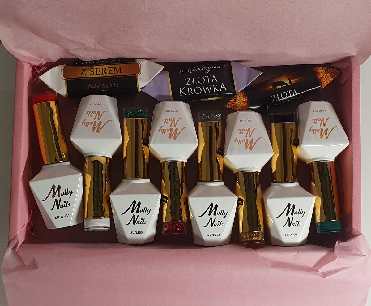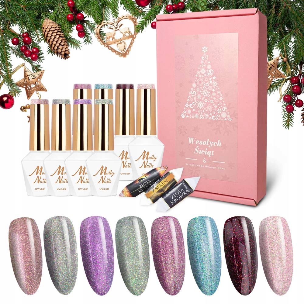 Molly Nails Shocking Shine Świąteczny zestaw do paznokci hybrydowych lakiery holo 8 sztuk + słodkości gratis