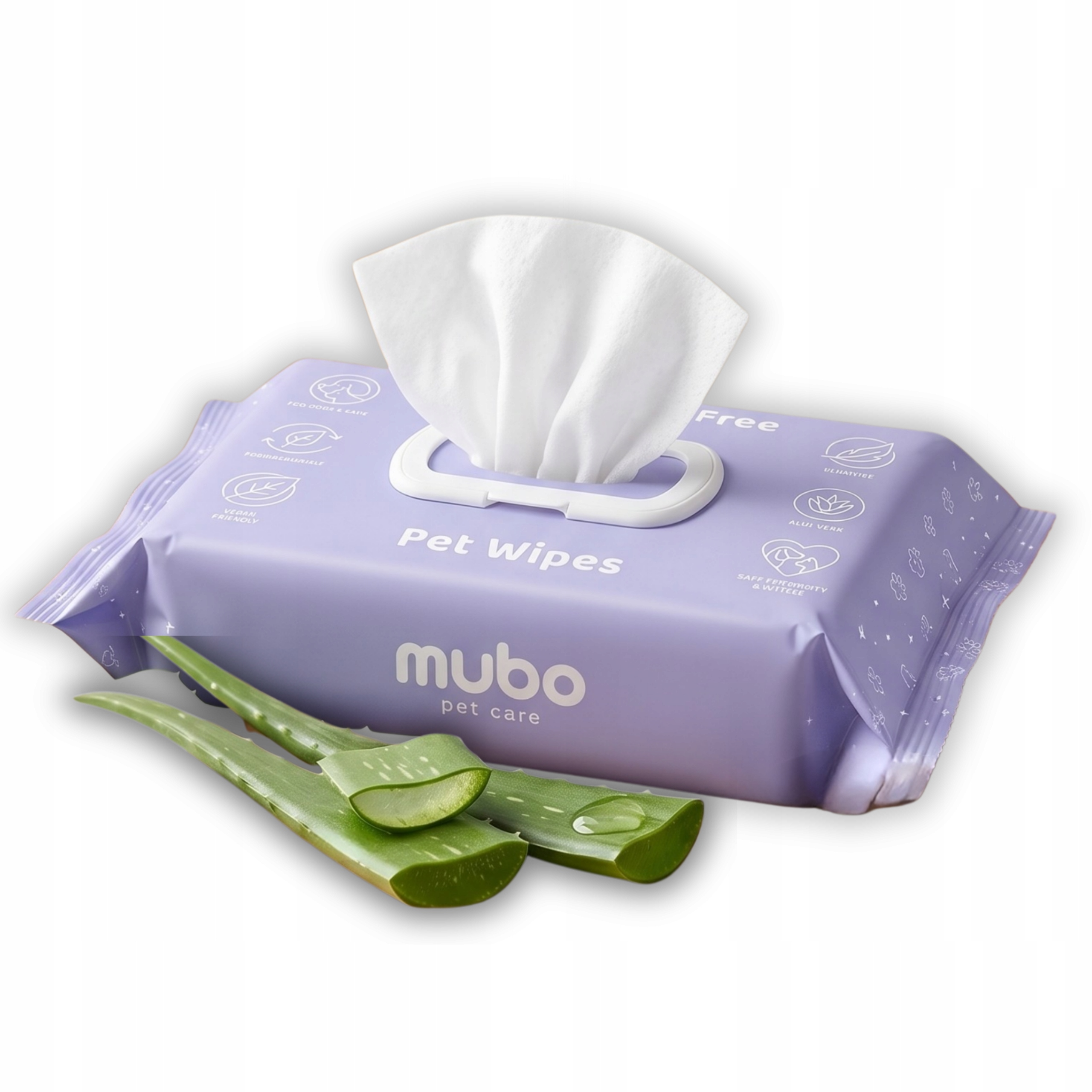 Mubo Chusteczki Pielęgnacyjne Nawilżane dla Psa i Kota Bezzapachowe z Aloesem Biodegradowalne Wegańskie 15x30 cm 100 szt