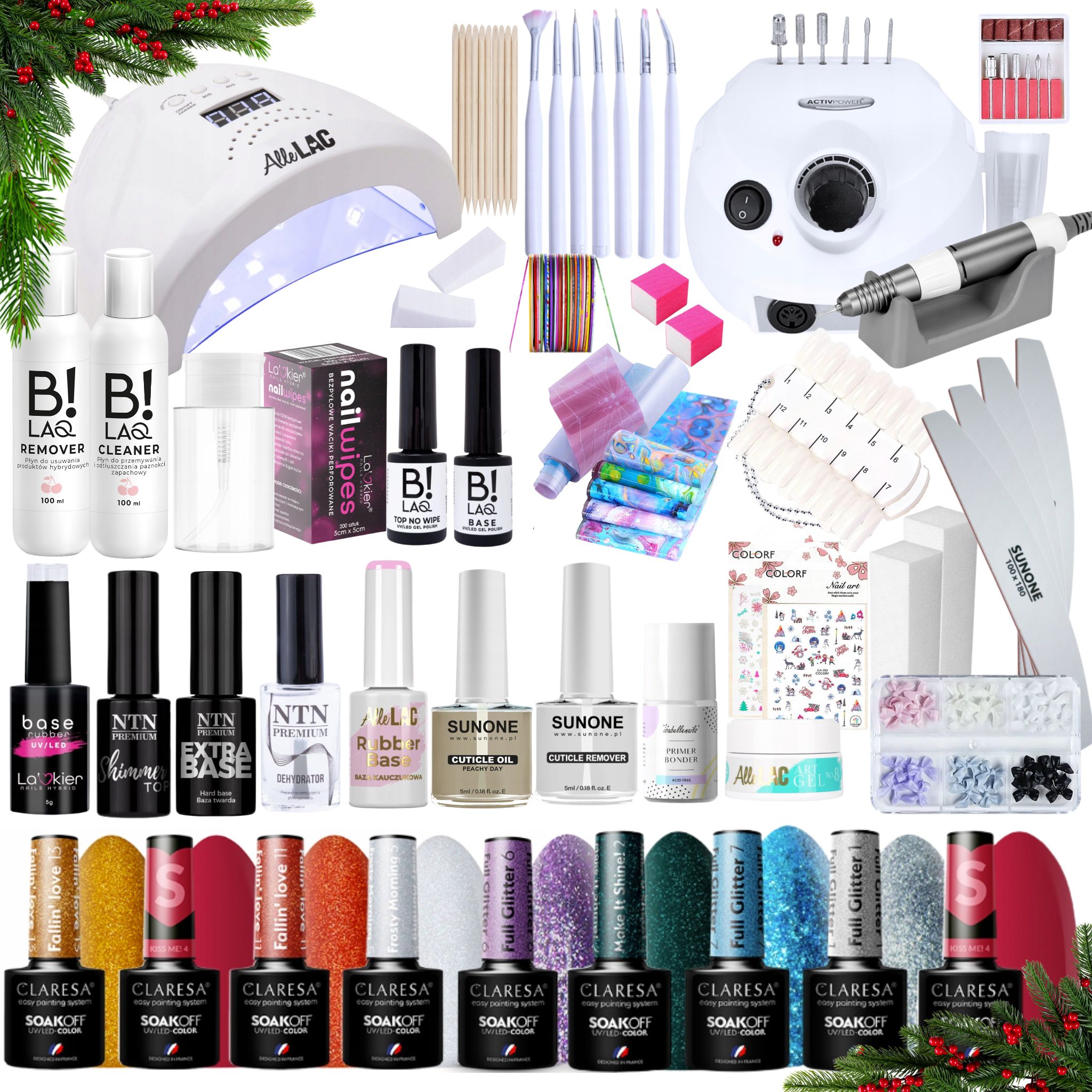 Prezentowy zestaw do paznokci hybrydowych - lampa + frezarka + 10x lakier hybrydowy Claresa 5g + preparaty + akcesoria