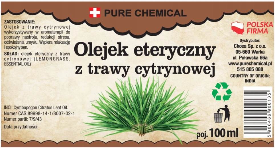 Pure Chemical™ jest Twoim zaufanym dostawcą oleju eterycznego z trawy cytrynowej, zapewniającym 100% naturalny produkt. Nie zawiera żadnych dodatków chemicznych, parabenów, silikonów, konserwantów czy sztucznych aromatów..