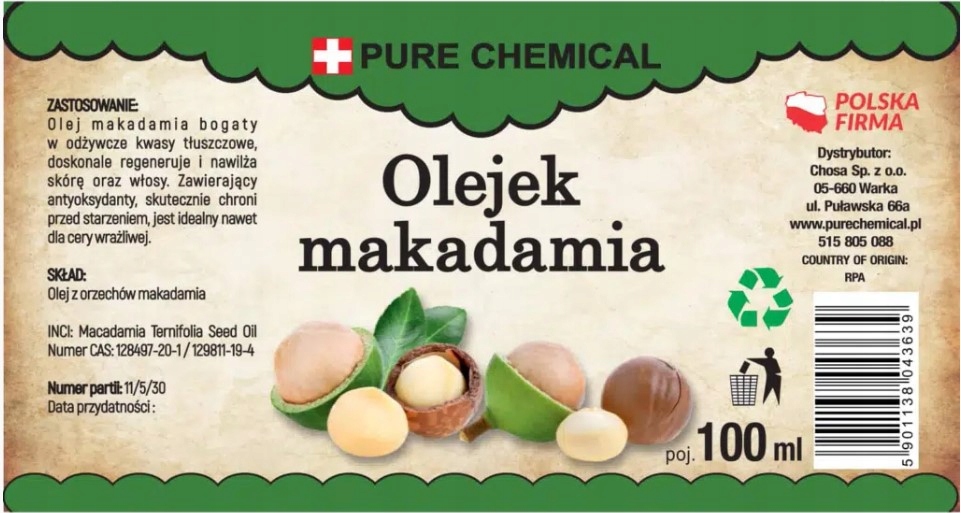 Olejek makadamia Pure Chemical™ pochodzi z serca Republiki Południowej Afryki, z obszarów, gdzie orzechy makadamia rosną w naturalnych warunkach. Tylko najzdrowsze i najbardziej dojrzałe orzechy makadamia są wybrane do produkcji oleju. Z ich nasion, które są prawdziwym skarbem natury, uzyskujemy ten cenny olej. Zastosowane metody ekstrakcji gwarantują, że wszystkie dobroczynne właściwości są zachowane, a produkt końcowy jest czysty i wolny od sztucznych dodatków.