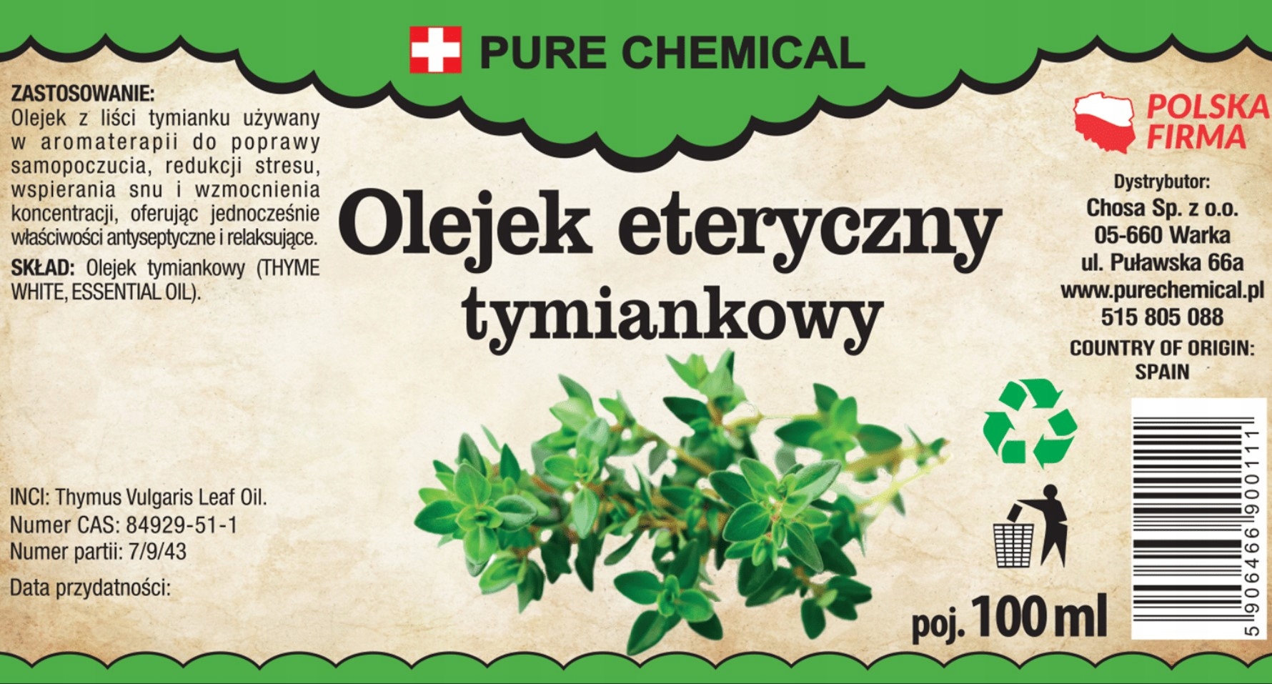 Pure Chemical™ jest Twoim zaufanym dostawcą oleju eterycznego tymiankowego, zapewniającym 100% naturalny produkt. Nie zawiera żadnych dodatków chemicznych, parabenów, silikonów, konserwantów czy sztucznych aromatów.