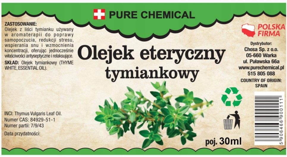 Pure Chemical™ jest Twoim zaufanym dostawcą oleju eterycznego tymiankowego, zapewniającym 100% naturalny produkt. Nie zawiera żadnych dodatków chemicznych, parabenów, silikonów, konserwantów czy sztucznych aromatów.