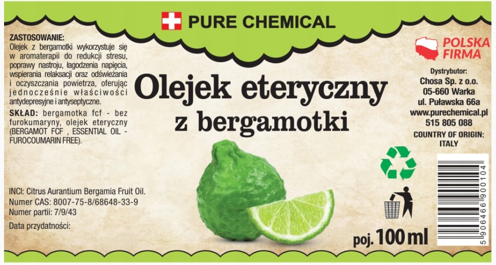 Pure Chemical™ jest Twoim zaufanym dostawcą oleju eterycznego z bergamotki, zapewniającym 100% naturalny produkt. Nie zawiera żadnych dodatków chemicznych, parabenów, silikonów, konserwantów czy sztucznych aromatów.