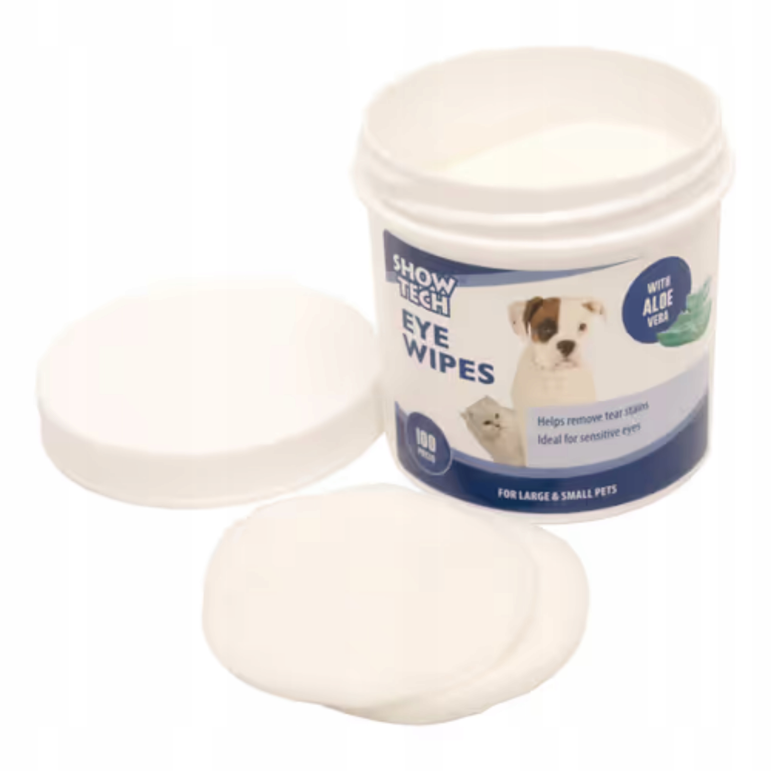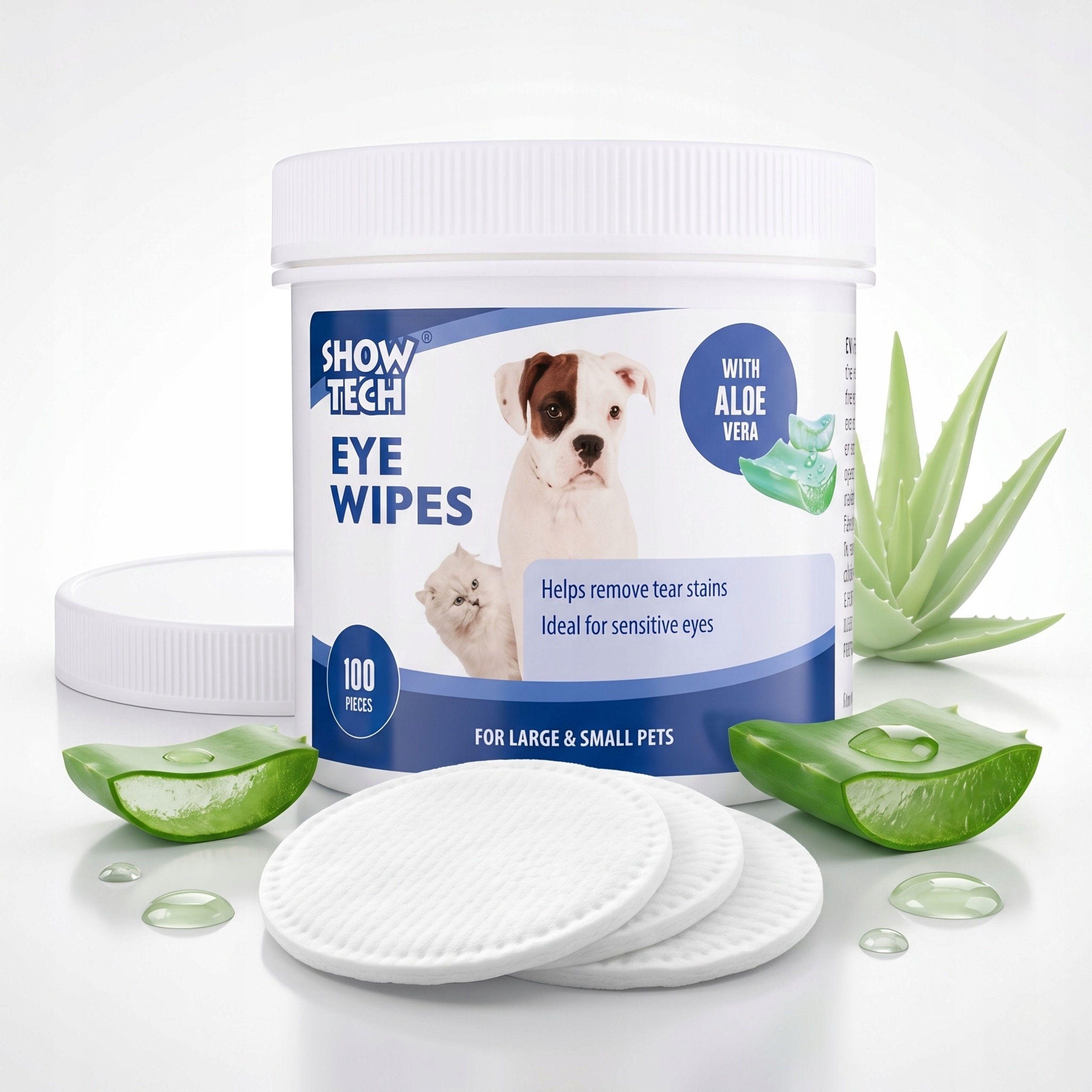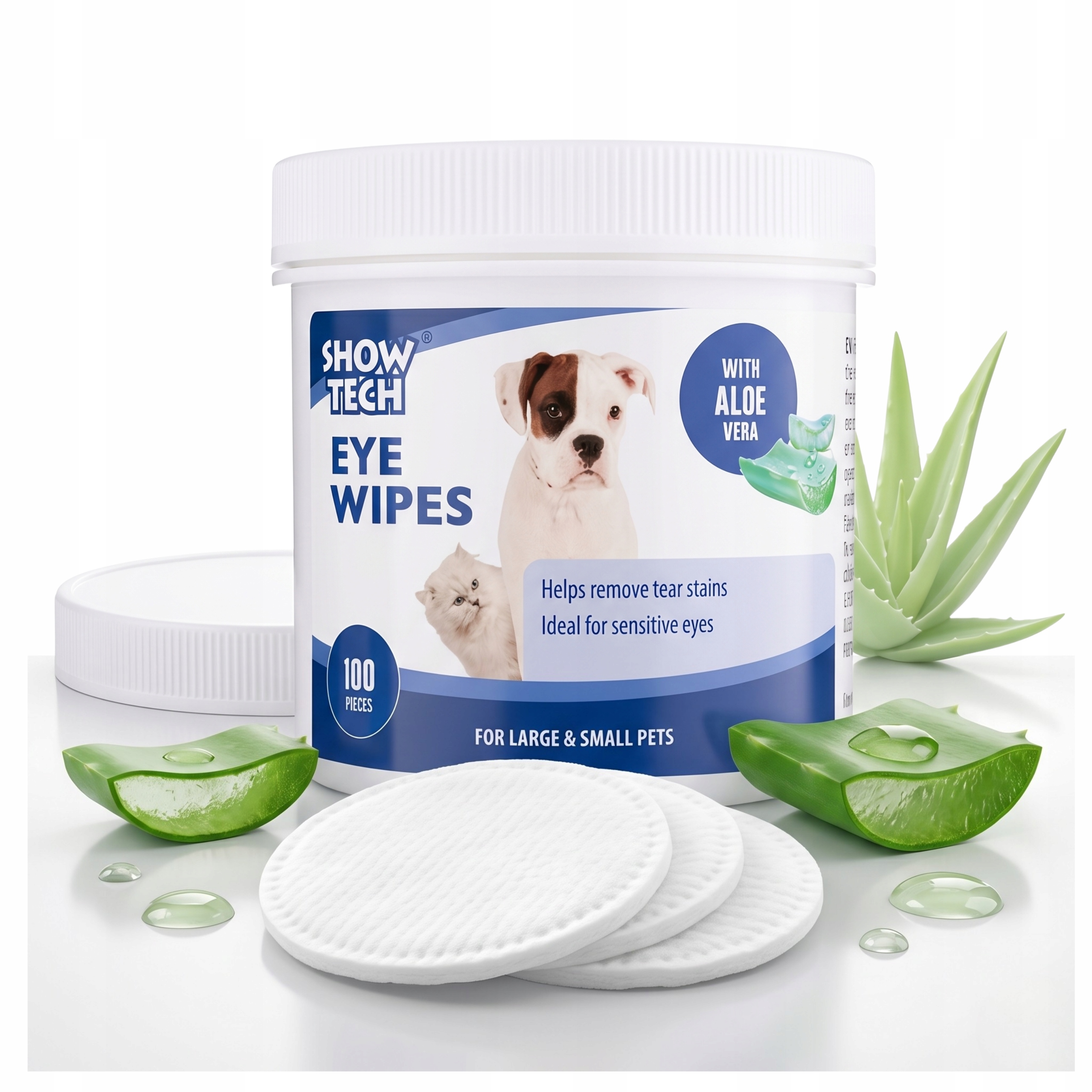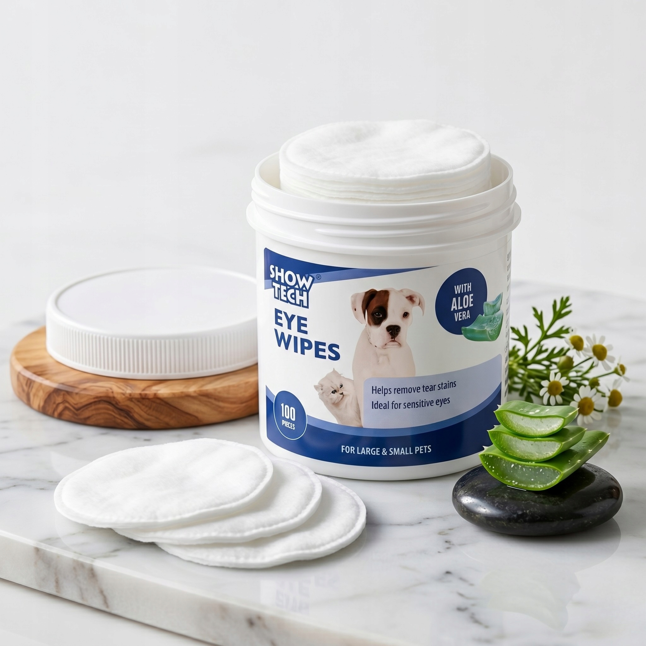 Czyste oczy bez zacieków w 30 sekund – Show Tech Eye Wipes to nasączane waciki z ekstraktem aloesu do codziennej pielęgnacji okolic oczu psów i kotów. Sto gotowych do użycia płatków 60 mm szybko usuwa zaschnięte łzy, śluz, kurz i przebarwienia, pozostawiając skórę wokół oczu czystą, nawilżoną i chronioną.