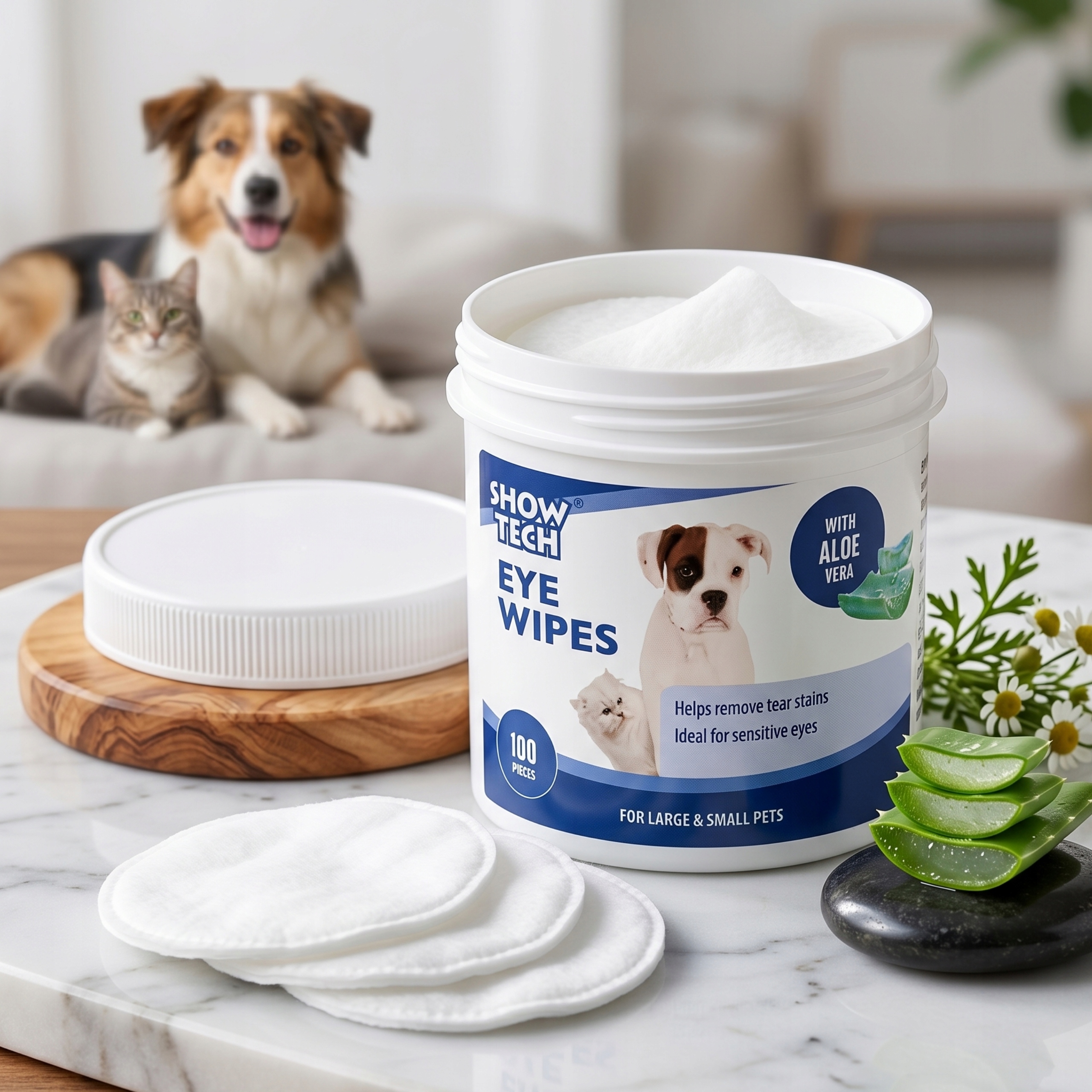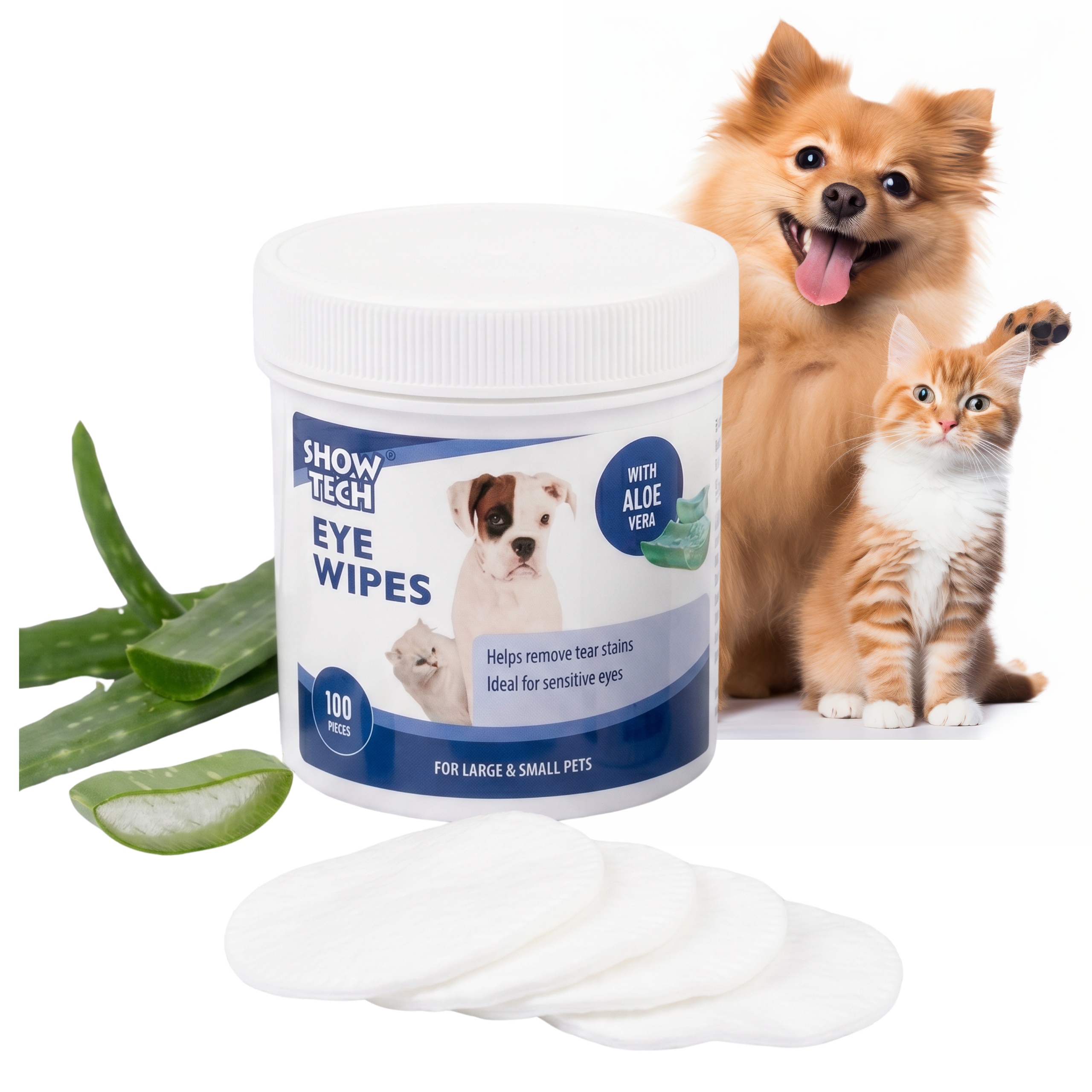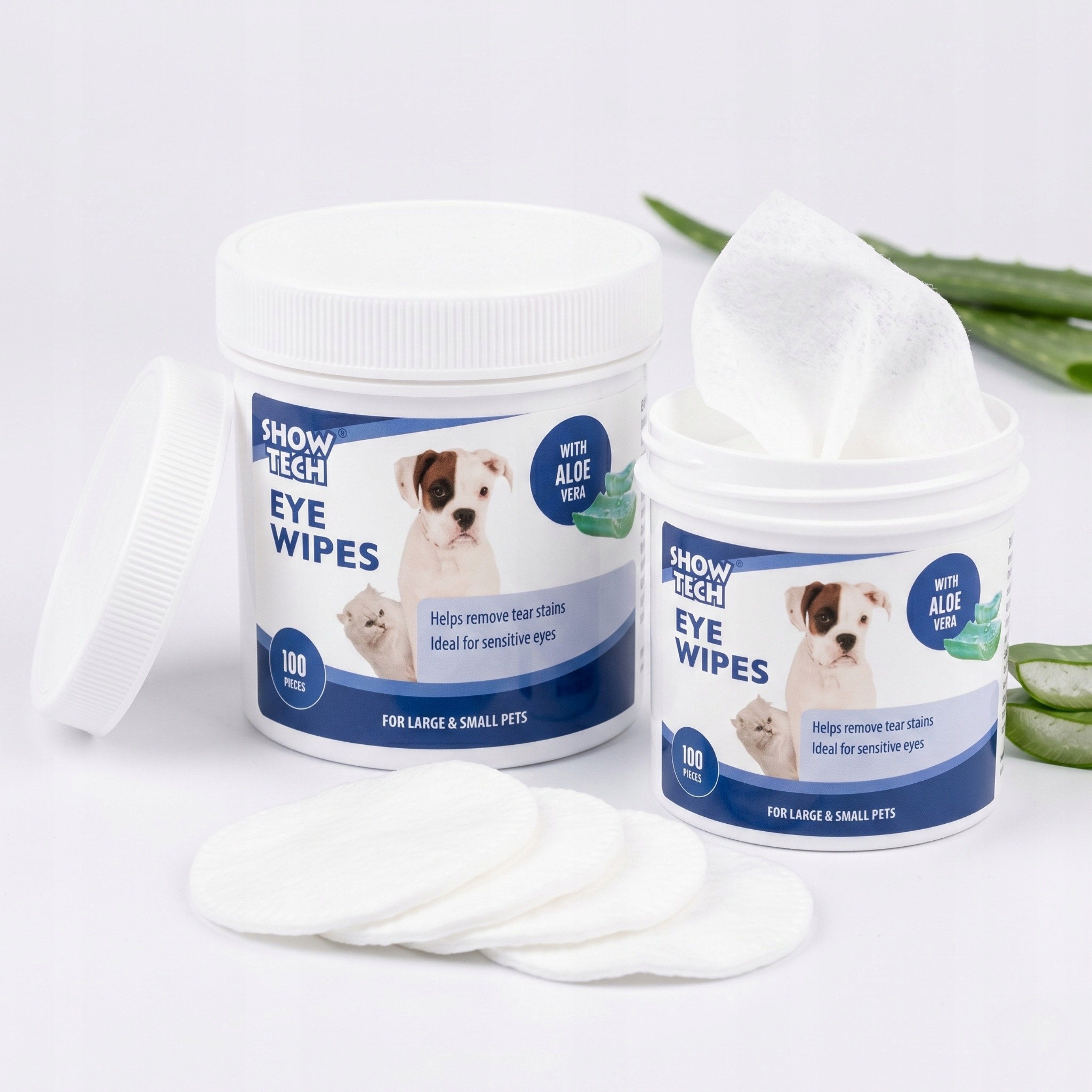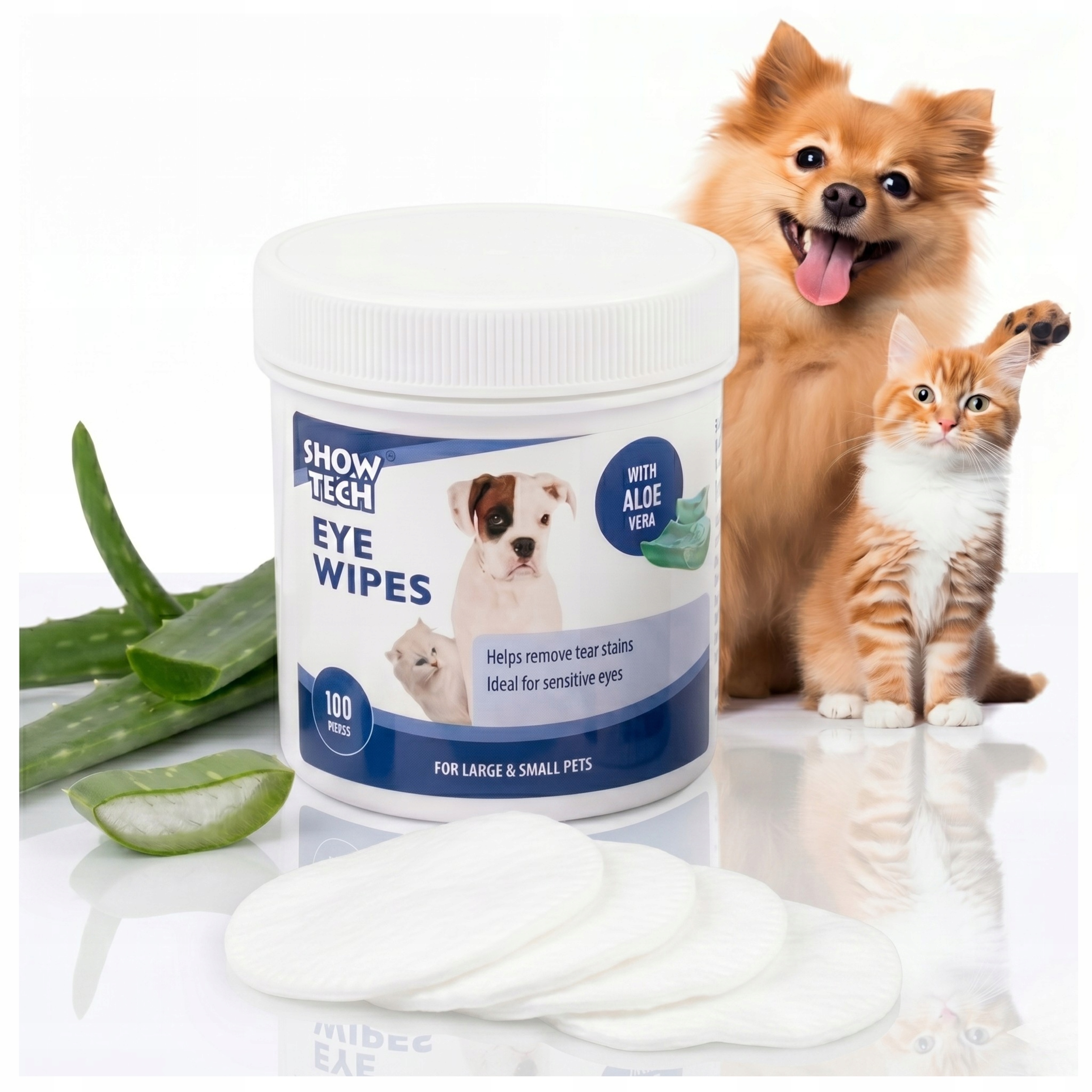 Czyste oczy bez zacieków w 30 sekund – Show Tech Eye Wipes to nasączane waciki z ekstraktem aloesu do codziennej pielęgnacji okolic oczu psów i kotów. Sto gotowych do użycia płatków 60 mm szybko usuwa zaschnięte łzy, śluz, kurz i przebarwienia, pozostawiając skórę wokół oczu czystą, nawilżoną i chronioną.