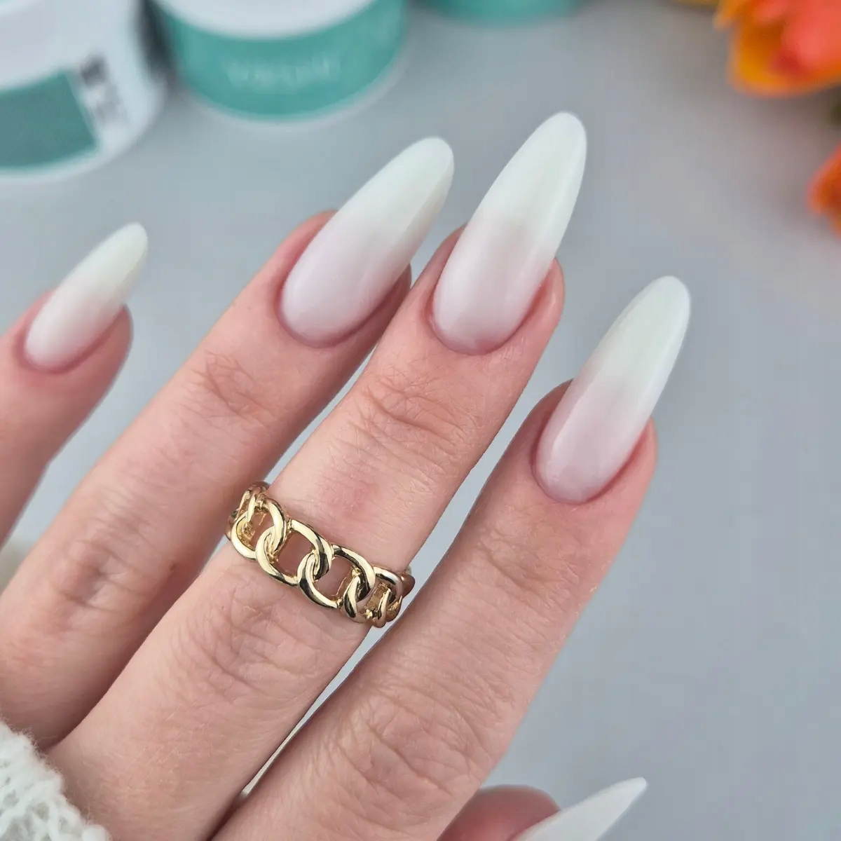 Kolor 01 - Klasyczny, mleczny odcień o wysokim stopniu krycia (4/5), który daje czysty, jednolity efekt już po jednej warstwie budującej. Kolor jest neutralny i elegancki, bez wyraźnych tonów różu czy beżu.